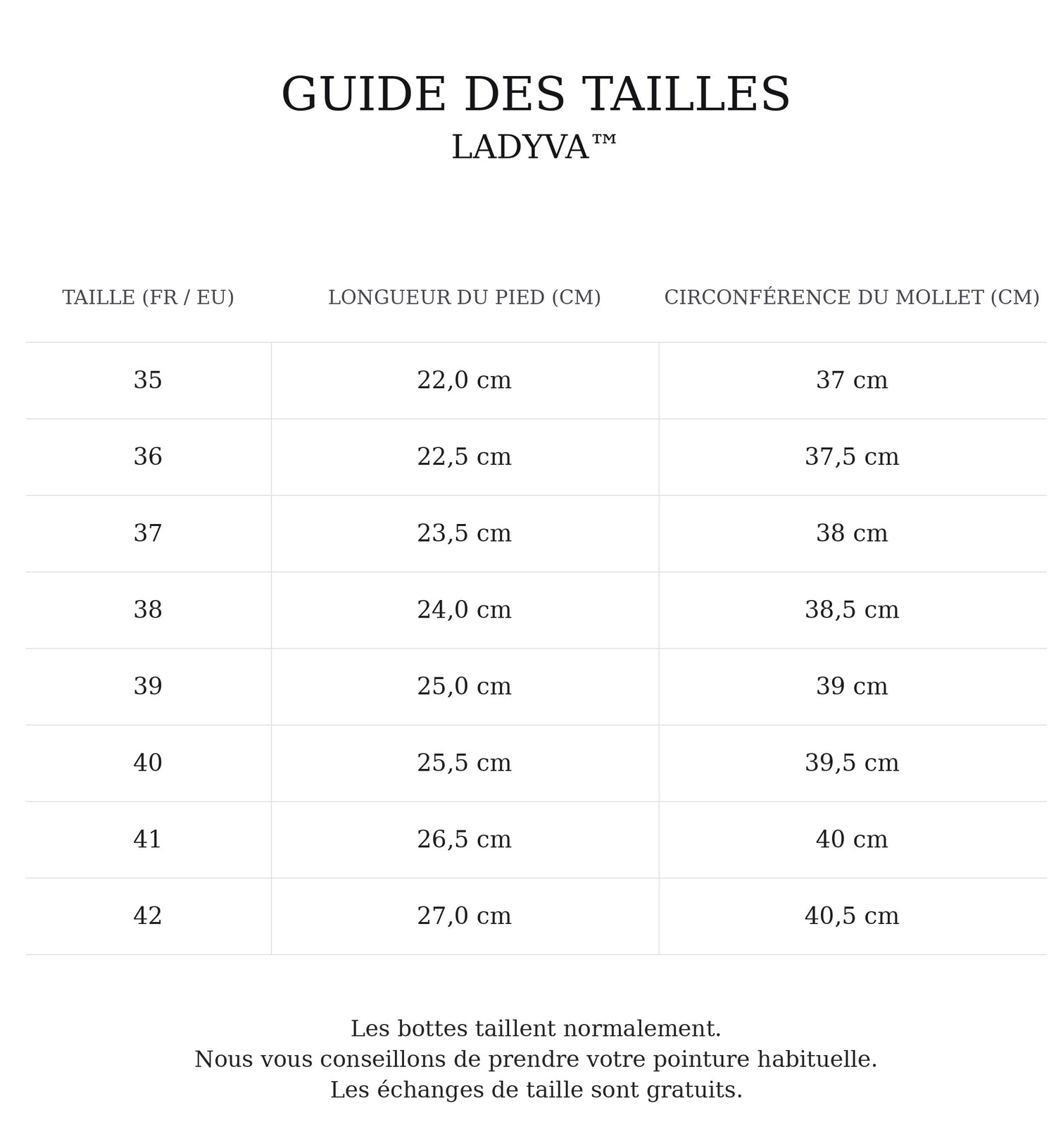Si la taille souhaitée est en stock, nous serons ravis d’effectuer un échange. Il vous suffit de contacter notre support client à contact.ladyva@gmail.com.
